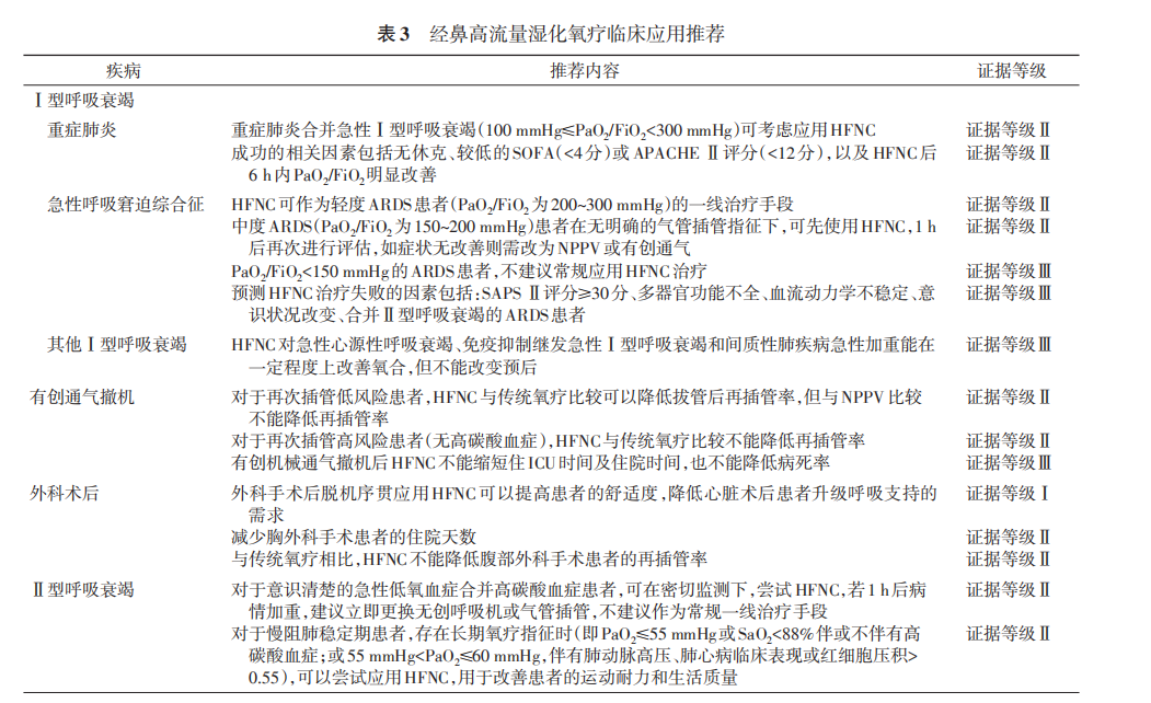 推荐建议:HFNC对急性心源性呼吸衰竭、免疫抑制继发急性Ⅰ型呼吸衰竭和间质性肺疾病急性加重能在一定程度上改善氧合(证据等级Ⅲ),但不能改变预后(证据等级Ⅱ)。