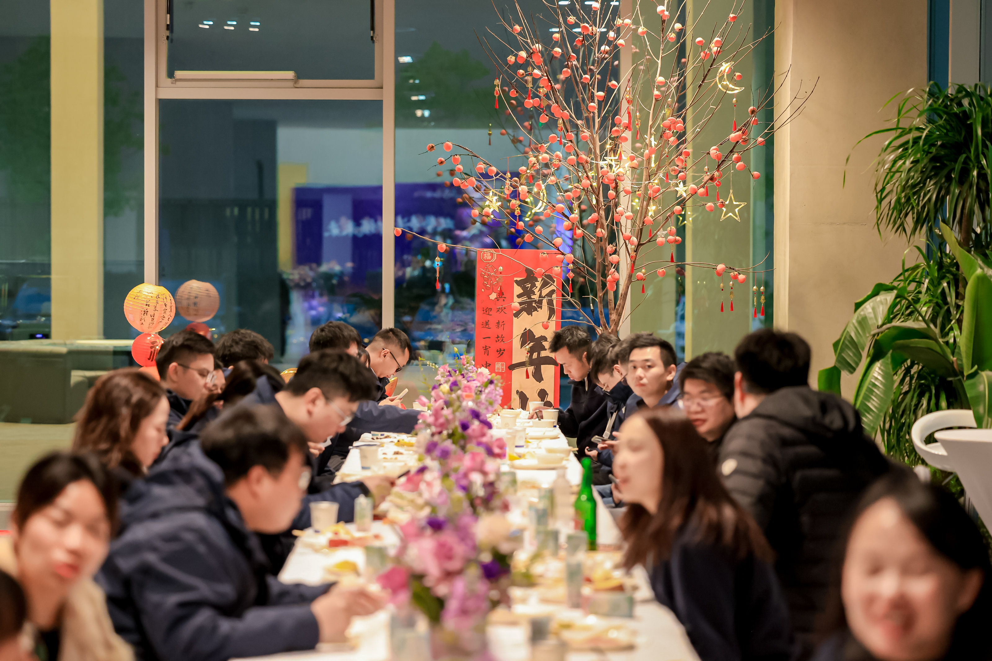 总结表彰大会后,温馨而热闹的欢庆晚宴拉开帷幕。会场张灯结彩,喜庆祥和。董事长戴总携管理层共同举杯,切蛋糕、开香槟,向大家致以新春的美好祝福。佳肴美酒,笑语欢声,其乐融融。