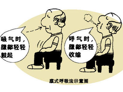 ③用缩唇呼吸法吸气,腹部同时向内凹。闭嘴,用鼻呼气,腹部同时外凸,稍停片刻。